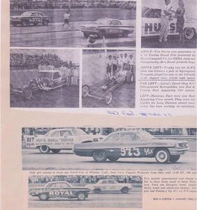 1961 Dad sold the 58 and bought a new 61 Pontiac Ventura with a 389,Tri-Power carbs and Automatic trans.My Mom and Dad were very successful with the car and then Dad updated the engine to a 368 H.P.factory combination.Mom raced the car exclusively. Dad went to work for Mickey Thompson.He worked with Hayden Proffitt,61-62,and they built some AWESOME race cars.Record runs and many win lights and National wins were the norm for my parents during this time era. NHRA did not allow women to race at indy in 1961.They wanted to race at Indy so we freshened everthing in our 61 and flat towed our 61 behind a friends 61 Pontiac.Dad built their motor,389 with a two barrel carb.Dad won with our car and our friend won with their Pontiac.Mom and Dad DROVE our 61 all the way back home with the trunk full with spare trans,all the awards and tools.